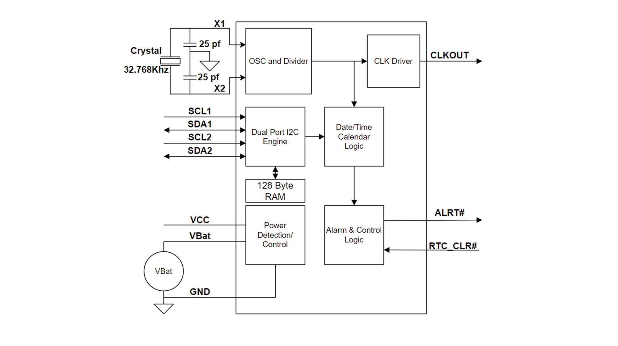 ? 支持雙I2C總線接口、 128字節(jié)的SRAM和電池切換